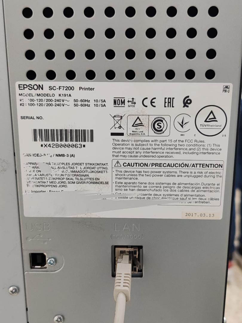 Plotter sublimatico EPSON Sure Color F7200, anno 2017. Perfettamente funzionante e correttamente manutenuto. Luce di stampa cm 160. Possibilità di test stampa sul posto.