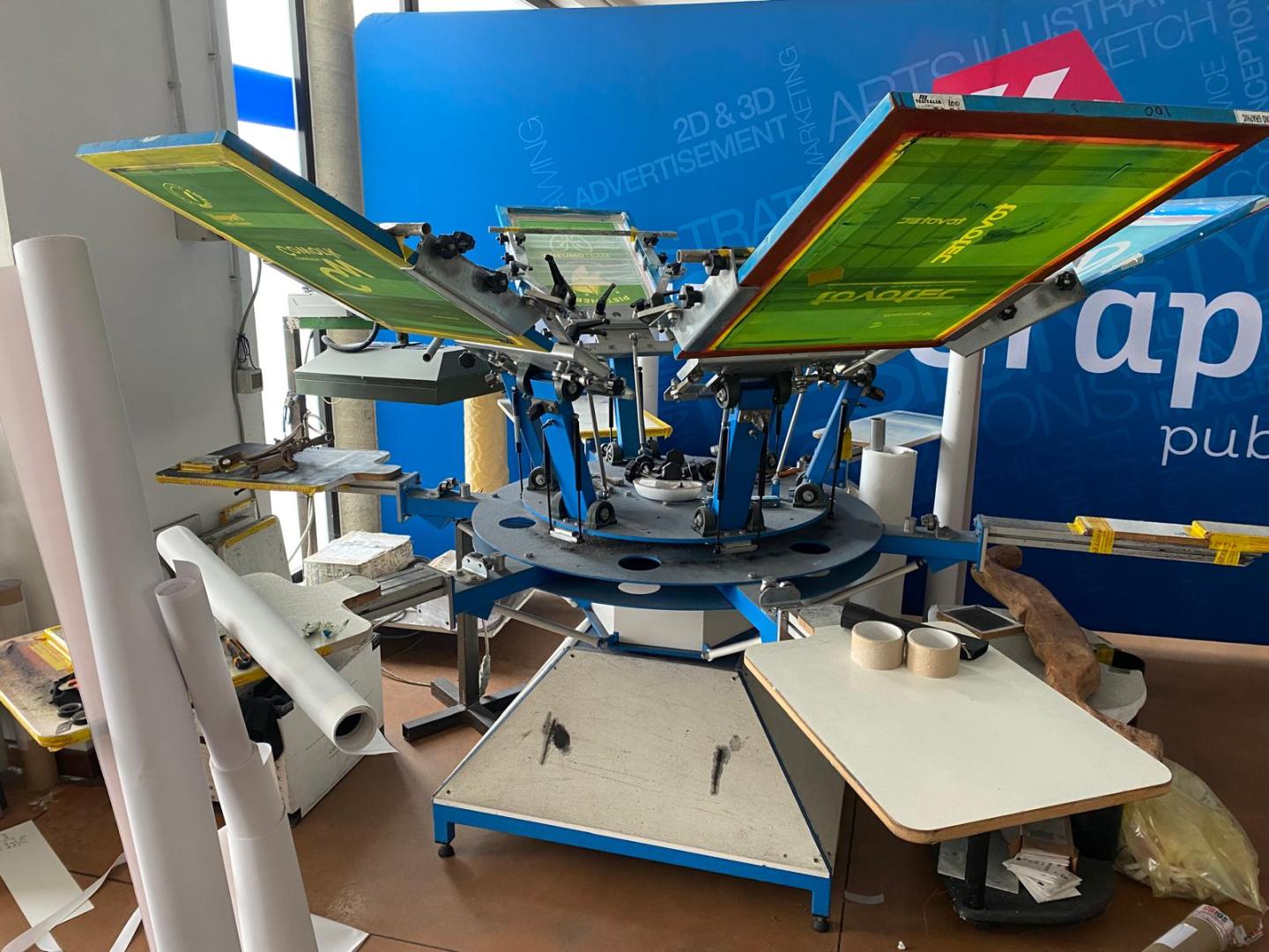 8) Banchetto serigrafico manuale con telai per stampa berretti