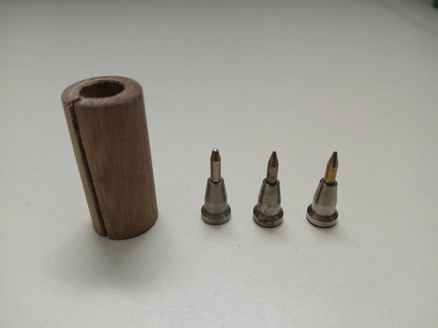 Completamente funzionante, utilizzata fino a pochi giorni fa unicamente per l'incisione di copertine di tesi di laurea, con 4 punte (2x0.5mm, 1x0.8mm, 1x1.2mm), cilindro sostitutivo in legno per la punta e 6 rotoli di foil in parte già utilizzati (oro lucido, oro opaco, blu, nero, bronzo e argento).